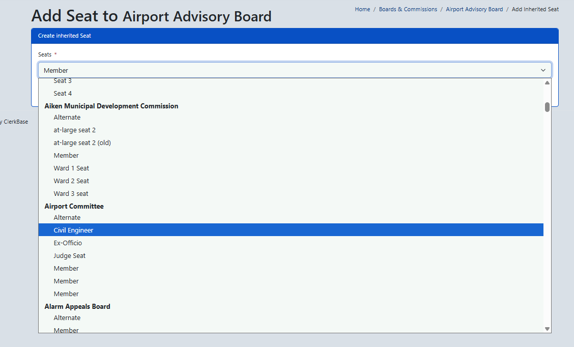 So now you need to add an inherited seat to the Airport Advisory Board. So you would add a seat but click on the down arrow and choose Inherit seat