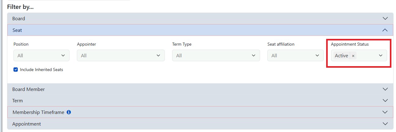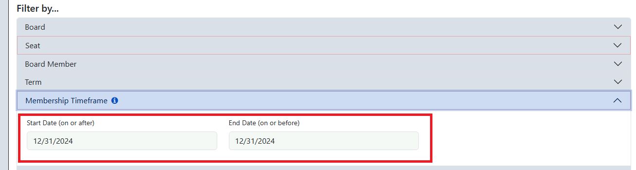 All you need to filter is for active appointments under a membership timeframe of 12/31/2024 and that should give you however is an active board member on the date(s).
